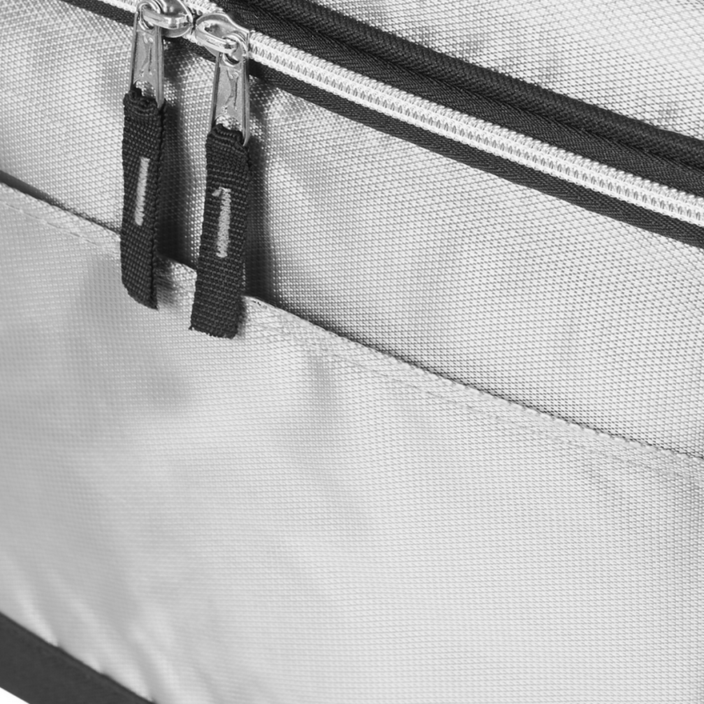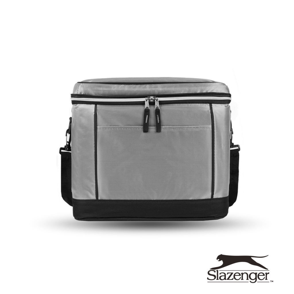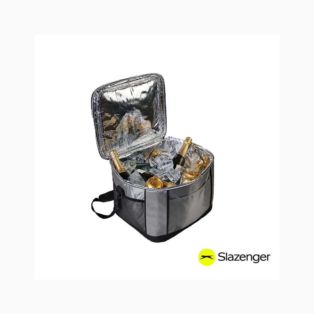 Realizado en 600D Polyester y 420D Dobby. Interior en aluminio. Compartimiento principal con doble cierre y bolsillo frontal con velcro. Medidas: 34,5 x 31 x 29,5 cm. Capacidad: 31,5 Lts. Foto ilustrativa, no incluye bebida. Slazenger